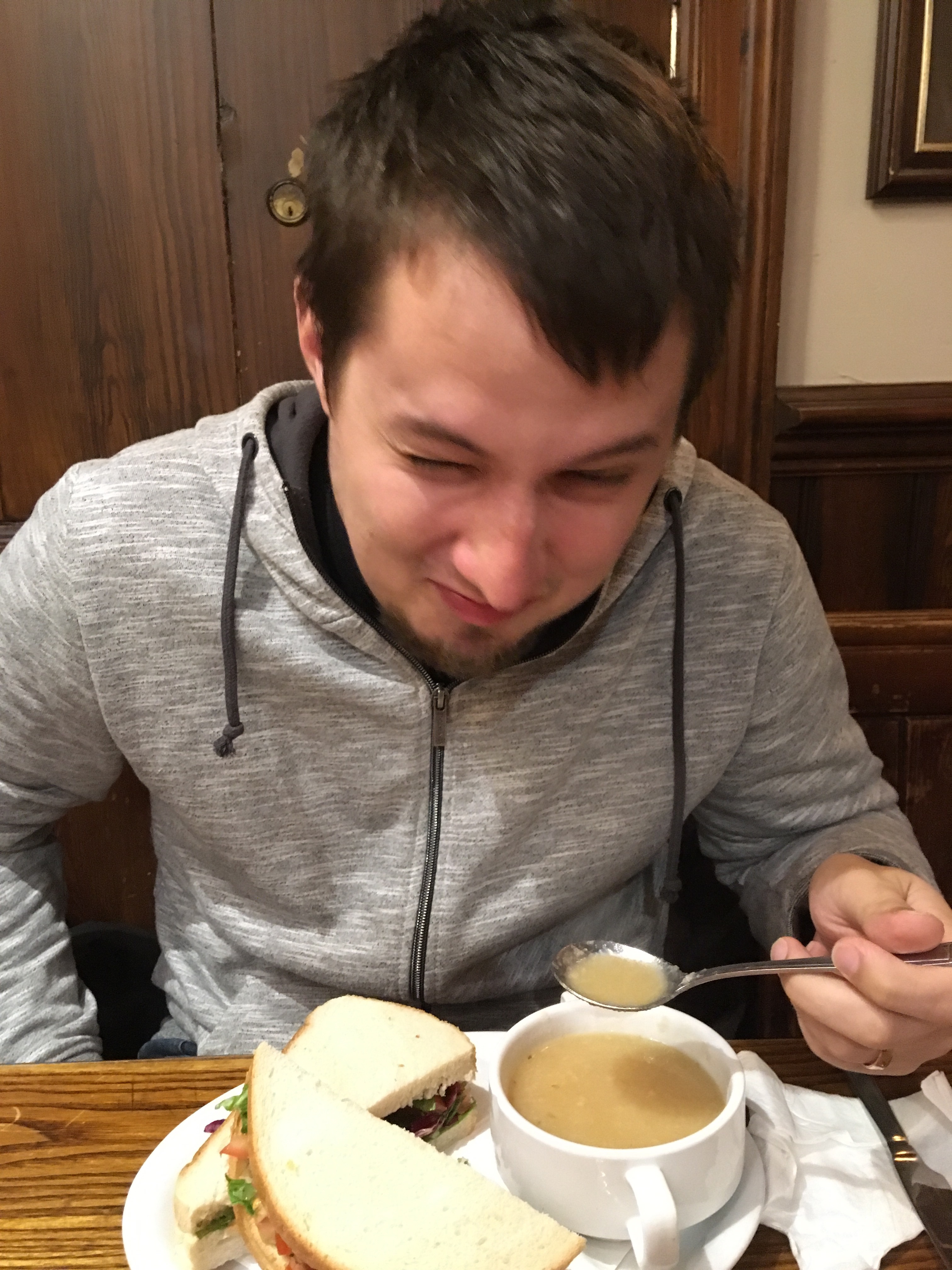 Egy nap, talán kedden, rá is böktünk egy étterem/pub-ra, hogy oda jó lenne bemenni, mert éhesek is vagyunk, meg esik is. Be is mentünk a “The Grog & the Gruel” nevű helyre, ahol hosszas találgatás után Timi egy pizzát rendelt, Ákos pedig egy csomagot választott, aminek a lényege, hogy két szendvics mellé kapsz egy kávét és egy levest. Itt kezdődtek a gondok 😀