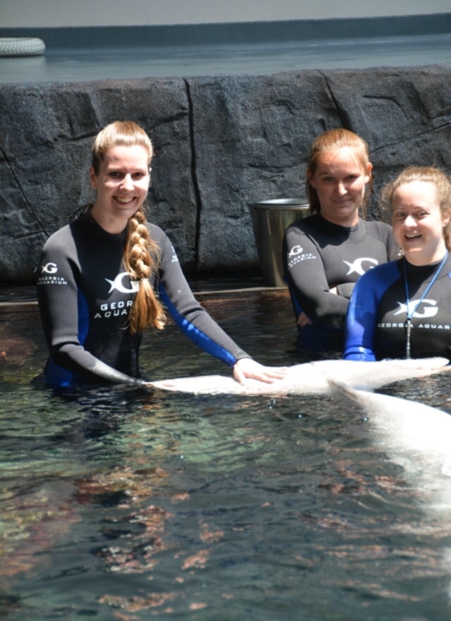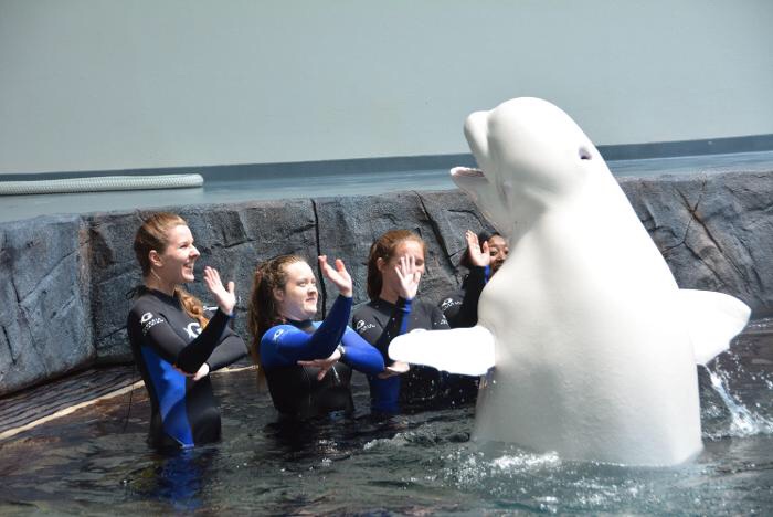 A látogatás fénypontja egyértelműen az állatokkal való találkozás és ez az élmény Timinek megadatott: részt vehetett egy összességében két órás programon, amelynek keretei közt egy rövid tréning után testközelbe kerülhetett az akvárium Belugáival, ahol a résztvevők megsimogathatják az állatokat, tanulhatnak róluk es alapvető kézjeleket adhatnak nekik, termeszetesen a trénerek szigorú felügyelete és irányítása mellett, az állatok jóllétét szem előtt tartva. Hogy milyen volt közöttük? Nem hiszem, hogy feltalálták az ezt leíró szavakat. Több, mint egy életre szóló élmény volt: