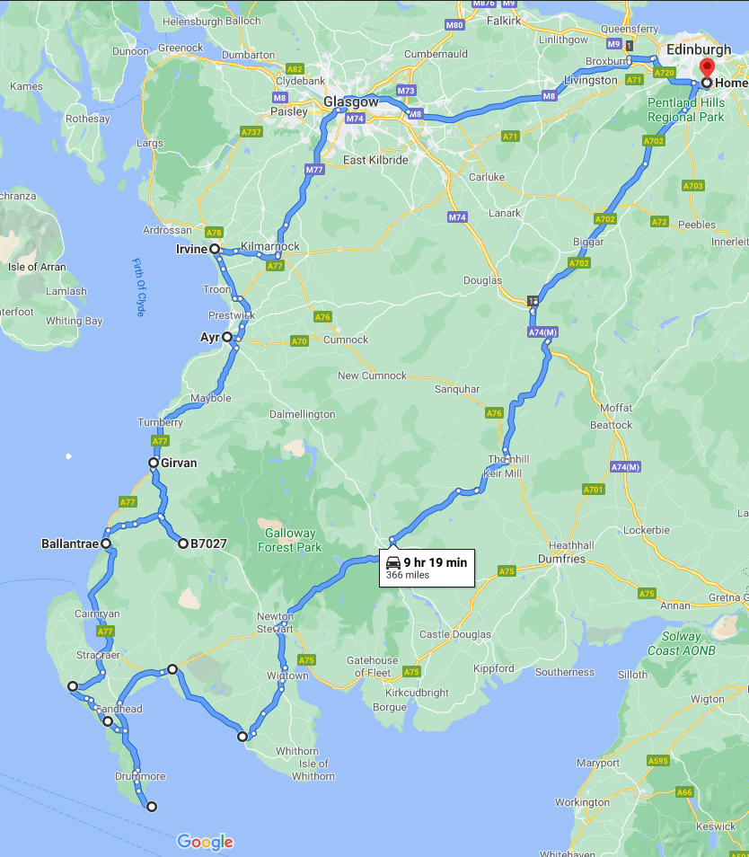 Ayrshire Skócia dél-nyugati részén található és attól függően hogy melyik részére indulunk, Edinburgh-tól két-három órára helyezkedik el. A mi tervünk az volt, hogy a part menti városokon keresztül (Irvine, Troon, Ayr), egy csendes kis falucskában (Barrhill) éjszakázva a parton tovább haladva (Portpatrick, Port William) “lecsorgunk” Dumfries & Galloway felé, egészen a sziget legdélibb pontjáig (Mull of Galloway).
