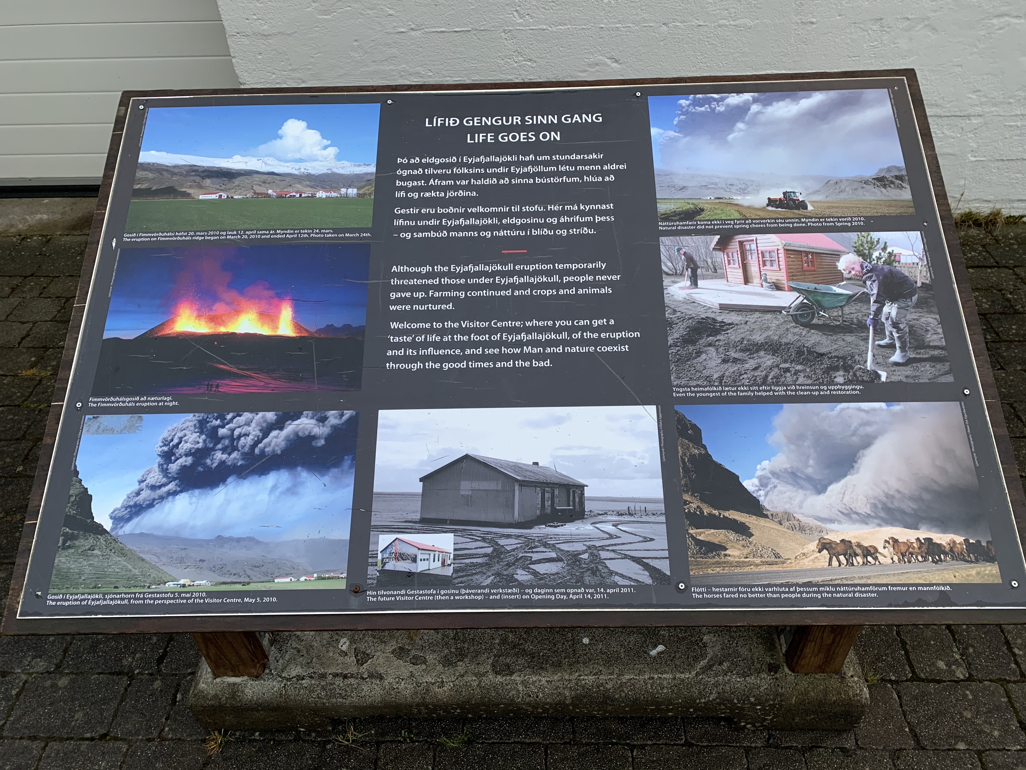 Első állomásunk az 1651 méter magas Eyjafjallajökull volt, a 2010 áprilisában kitört híres gleccservulkán (az Eyja jelentése “sziget”, fjalla jelentése “hegy”, jökull pedig “gleccser”, tehát Eyjafjallajökull valami olyasmire fordítható, hogy a “sziget hegyi gleccsere”), amely kitörésekor jelentős fennakadást okozott az európai légiforgalomban. A vulkán lábánál elhelyezkedő farm is jelentős károkat szenvedett, azonban a legnagyobb problémát nem a láva vagy hamu jelentette, ahogy azt elsőre gondolhatnánk, hanem a vulkáni kürtőt befedő jégsapka olvadása miatti árvíz. Az időjárásnak hála magát a vulkánt csak nagyjából láttuk (nagyon ködös időnk volt reggel) és a vulkán lábánál lévő látogatóközpont sem volt nyitva, de így is nagy élmény volt. Érdekesség, hogy az Eyjafjallajökull kitöréseit a múltban szinte mindig követte nagyobb “testvérének”, a Katla vulkánnak a kitörése (amely egyben a vík-i szállásunk névadója).