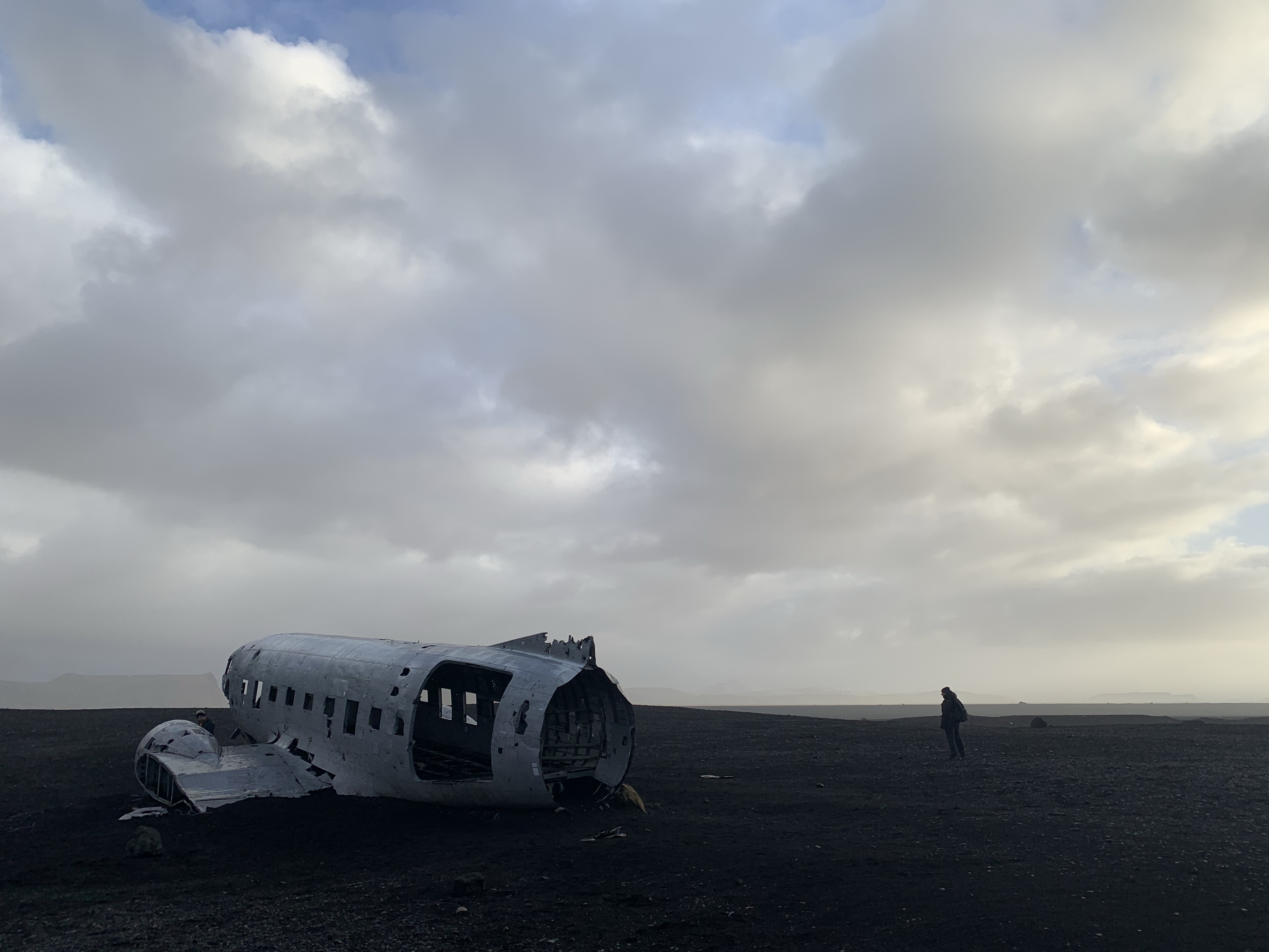 A vízesés után indultunk is tovább egy újabb partszakasz felfedezésére, azonban figyelmesek lettünk valamire: a főút melletti kis parkolóban meglepően sok autó állt – kellőképpen sok autó ahhoz, hogy valamilyen fontos nevezetesség vagy esemény legyen a közelben. Nem láttunk semmiféle táblát vagy kiírást, így maradt a bevált gyors “megguglizás”. Kiderült, hogy nem véletlen a mozgalmas parkoló – nem messze innen, a Solheimasandur-on található a tisztázatlan körülmények között lezuhant második világháborús amerikai haditengerészeti repülőgéproncs.